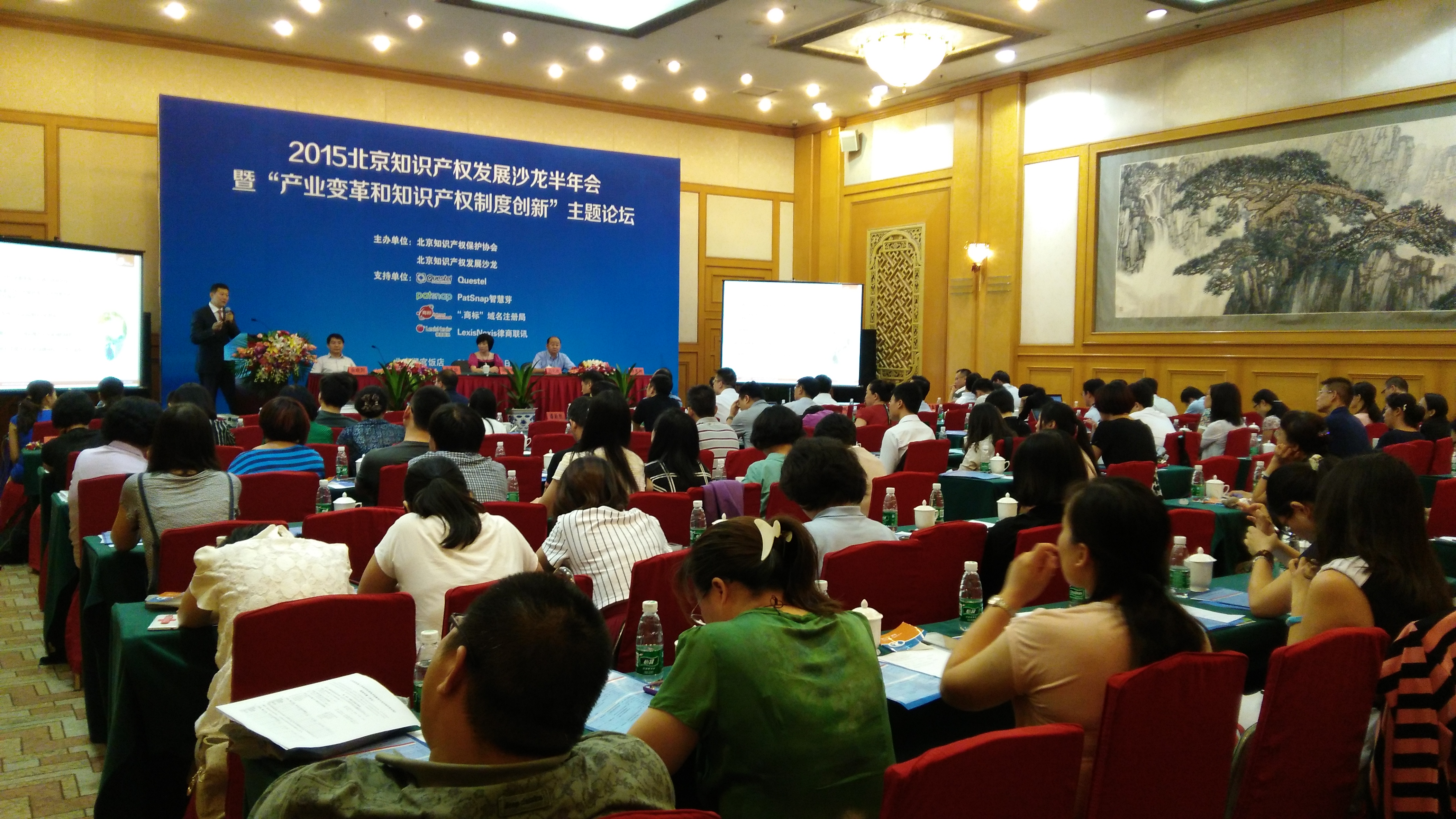 7月30日,由北京知识产权保护协会主办的2015年北京知识产权发展沙龙半年会暨 “产业变革和知识产权制度创新”论坛在北京翠宫饭店隆重召开。作为北京知识产权行业最有影响力的论坛,包括北京市知识产权局副局长潘新胜、国家知识产权局发展研究中心主任韩秀成、国务院法制办教科文卫法制司副巡视员金武卫、中国信息通信研究院信息化与工业化融合所主任刘默、中华商标协会副秘书长汪泽、万慧达知识产权代理公司高级合伙人黄晖、“.商标”域名管理机构中国区运营总裁吴养怡等国内多位知名专家和来自包括西门子、方正集团、小米、华为、北汽福田等企业界的代表共同参与有关知识产权变革和知识产权制度创新的主题研讨。超过百位来自北京知识产权界的知识产权从业者和企业界的代表参加了本次论坛。
